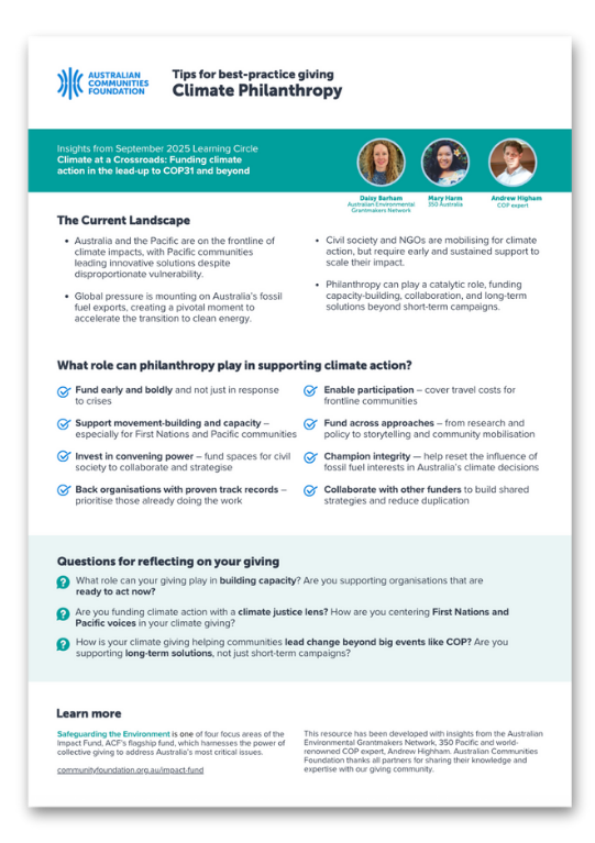 This resource has been developed with insights from the Australian Environmental Grantmakers Network, 350 Pacific and world-renowned COP expert, Andrew Highham. Australian Communities Foundation thanks all partners for sharing their knowledge and expertise with our giving community.