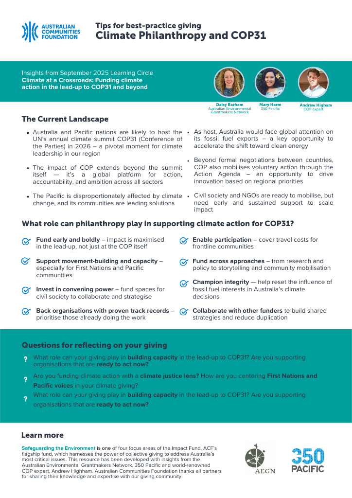 A resource developed with insights from the Australian Environmental Grantmakers Network (AEGN), 350 Pacific and world-renowned COP expert, Andrew Highham, offering best-practice tips for climate giving. Download