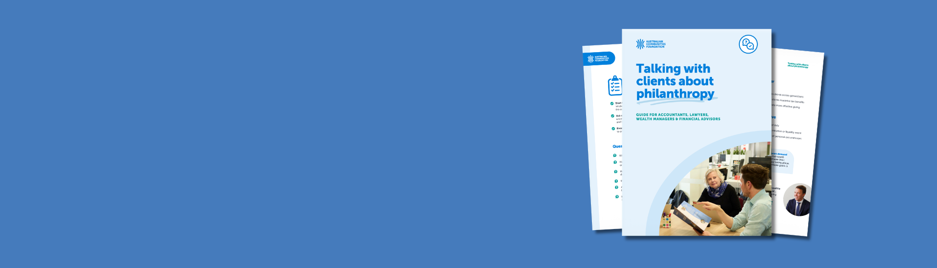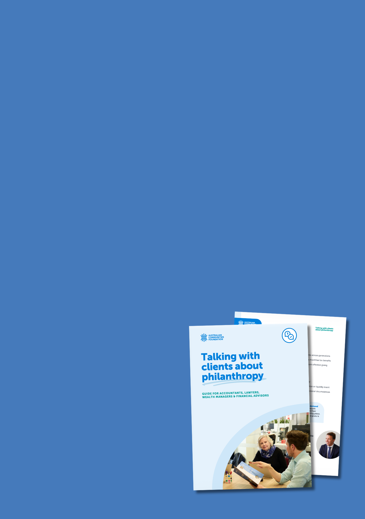 Australian Communities Foundation partners with professional advisors, including financial planners, wealth managers, lawyers and accountants, to provide philanthropic services that help clients achieve their charitable giving goals.